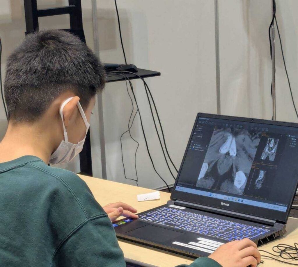 実際に体験では、当社の放射線治療AIソフトを搭載したノートPCを使い、参加者がCT画像上で腫瘍部分にマウスでマーキングする操作に挑戦しました。