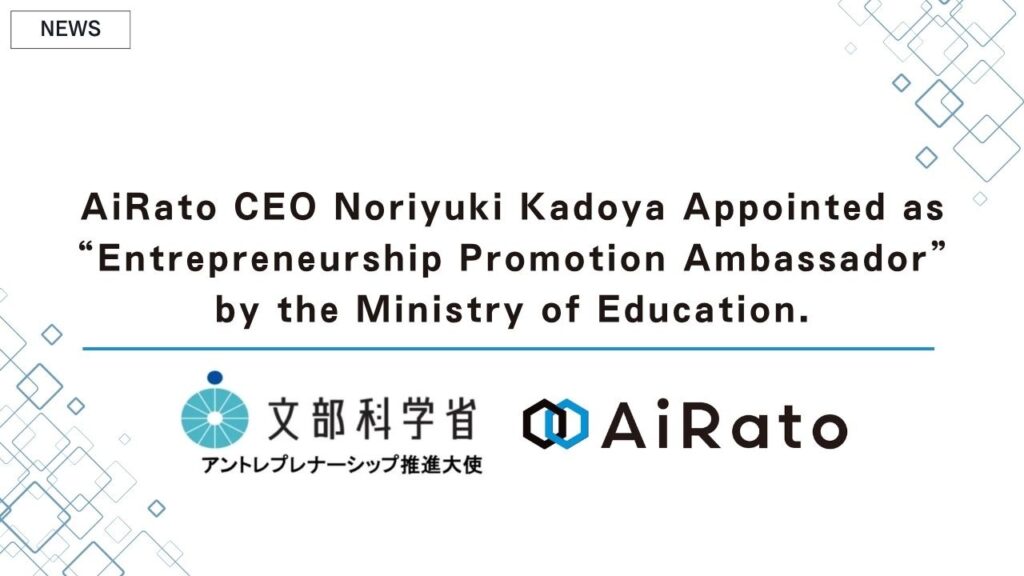 AiRato CEO Noriyuki Kadoya Appointed as “Entrepreneurship Promotion Ambassador” by the Ministry of Education.